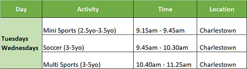 * Mini Sports (30 minutes) - $14 per session / $84 for term (6 weeks)